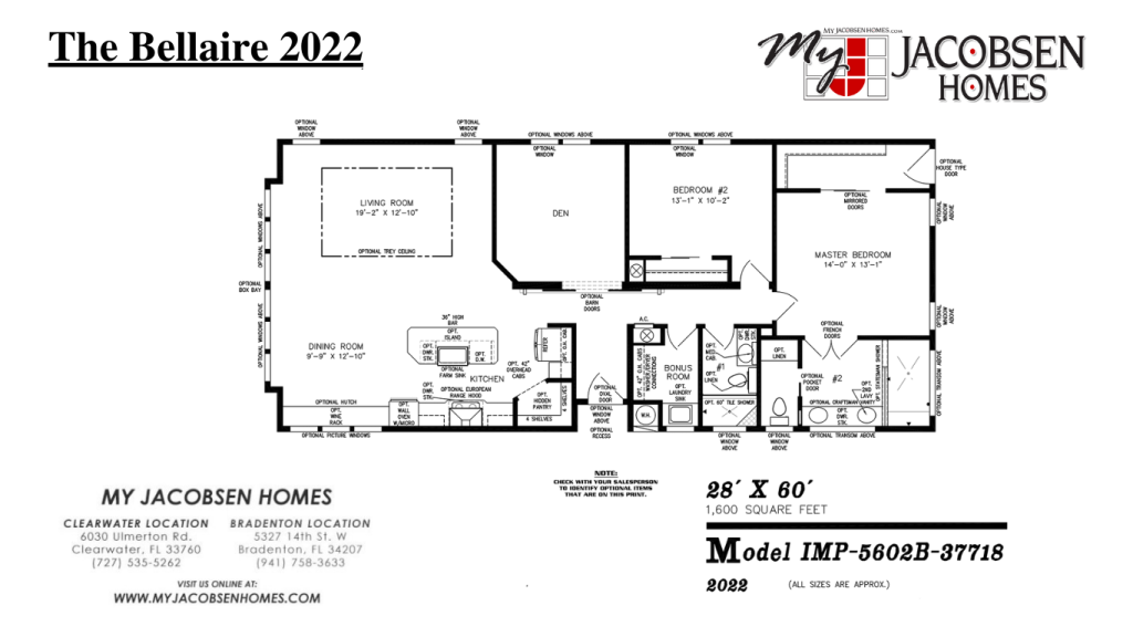 Modern elegant oval glass door side entry door flows into a warm and inviting open concept design, including a gourmet kitchen, welcoming dining room, and refined living room. Whether you are cooking or entertaining for 2 or 20, this sprawling kitchen is well equipped with GE stainless steel appliances, range hood perfectly enclosed with a European style glass / tile deco backsplash in shades of caramel, sea salt and espresso, which is framed by an extended rounded arch, ceramic black cook top, above wall oven, featuring a lavish center island / breakfast bar with single bowl steel 8’ farmers sink (Moen Camerist Protégé Spray faucet), abundance of counter space with decorative tile lip, extra-large 42” custom rich brown cabinets and drawers, plus a hidden corner pantry (4 tiers). Bright dining and living room are flooded with natural and LED lighting from 6’ sliding glass doors, walls of windows including large bay box and rectangular, recessed (LED) & Sky Tec lights, contemporary 5 arm chandelier, and an exquisite ceiling fan / light combo, that is nested into 9’ tower vault ceiling, finished by white 5” crown molding, 5” trim, and seamless drywall. Bonus room showcases double French door entry way that is ideal for a den, office, or 3rd bedroom. Separate utility or mud room includes a laundry sink, washer / dryer connections, 42’ wood cabinets, 2” faux wood blinds, and tile flooring. Guest bathroom includes 54” tub / shower combo with recessed shower light, china sink, mirrored vanity, and linen drawers. Both bedrooms include sliding closet doors, natural lighting and 2” faux wood blinds. Sophisticated king-sized master bedroom features “his” and “her” closets, exquisite ceiling fan / light combo, premium large thermal windows, and double French door entry to master bath. Fit for royalty, the master bathroom is bathed in light with elongated rectangular windows, includes “his” and “her” china (Meon) sinks, separate mirrored vanities, large countertop, 60” ambassador shower encloser with long tile bench, caramel toned backsplash accented with smokey glass deco (Sumatran tiger), recessed shower lighting, separate entry for handicapped accessible commode, 94” rich wood cabinets, and extra linen drawers. The Belleaire is fully customizable. Ask about adding an exterior package that includes a carport or garage, shed and driveway. Call today to schedule a tour of the Belleaire!