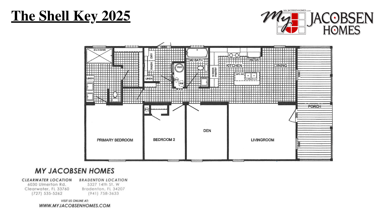 The Shell Key 1248 SQ. FT. | 2 Bedroom | 2 Bath | Den DOWNLOAD JACOBSEN FLOORPLANREQUEST JACOBSEN FLOORPLAN PRICING QUESTIONS? TEXT US!3D VIRTUAL TOUR Image Gallery Categories: 1,200 – 1,399 sq ft, 2 Bedroom Floorplans, Manufactured Home Model Center in Bradenton - Current Inventory, ScotBilt HomesProject navigationPreviousPrevious project:The Bayshore 2025